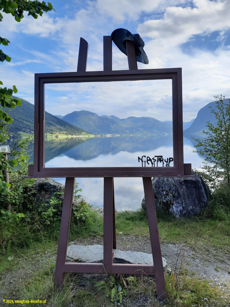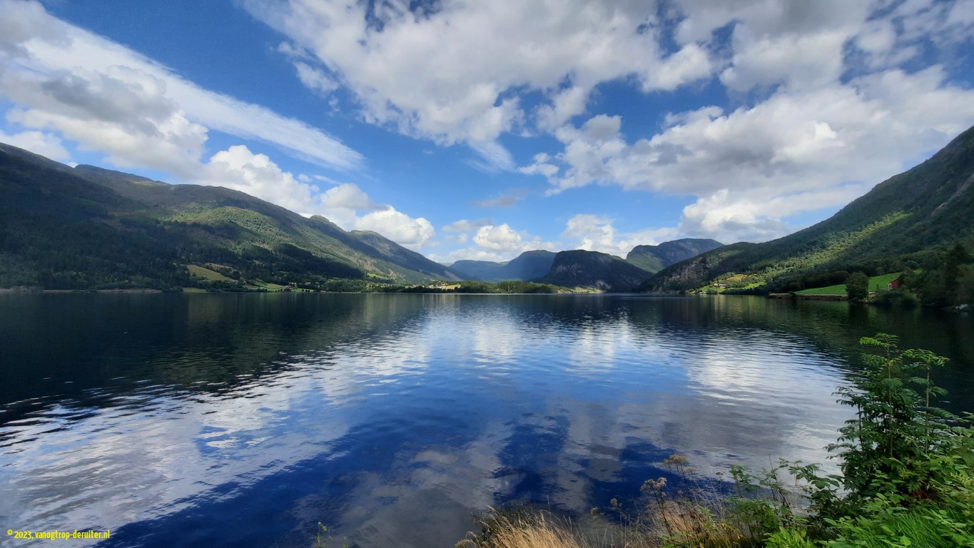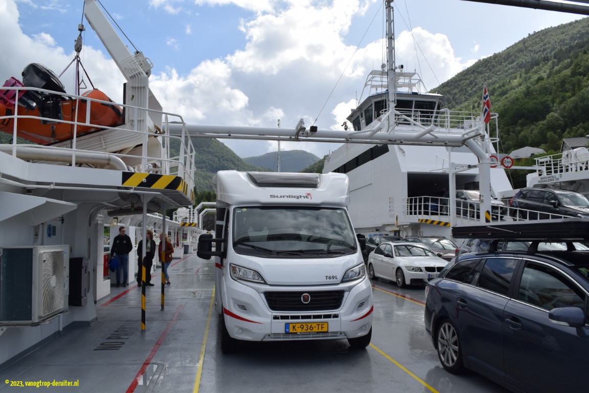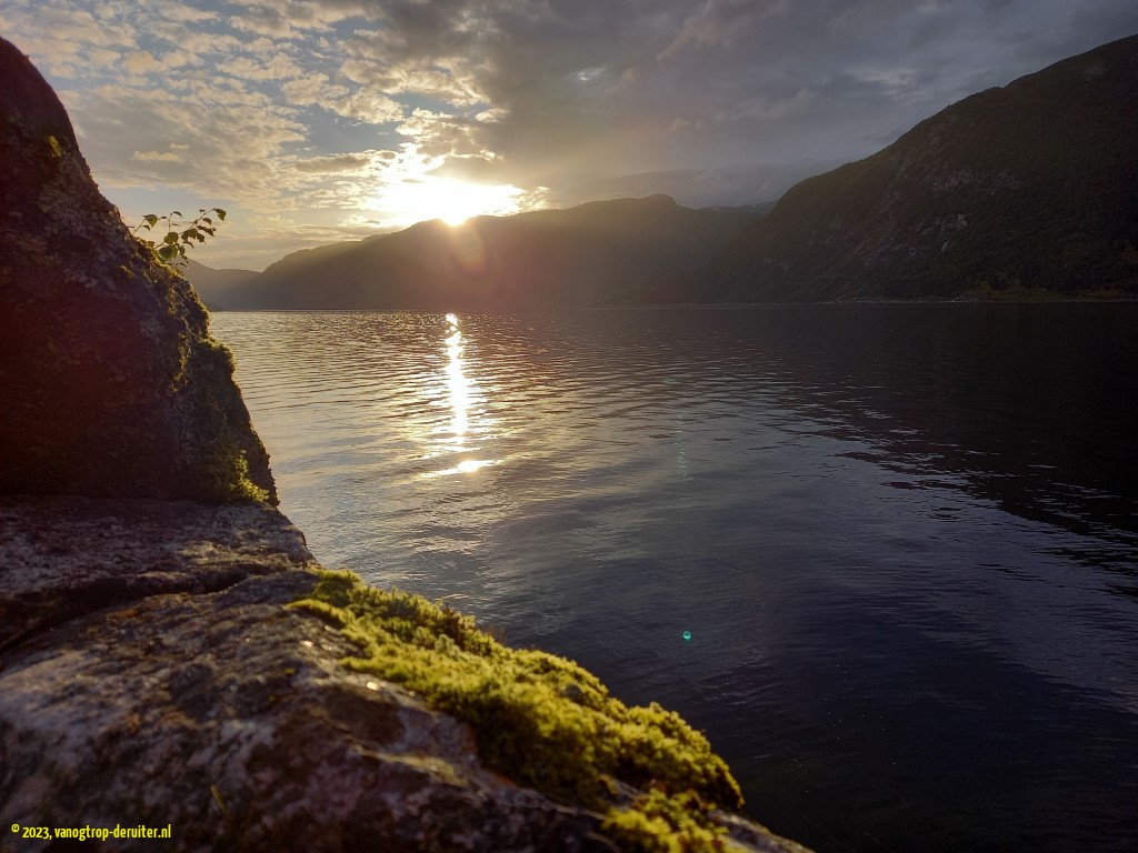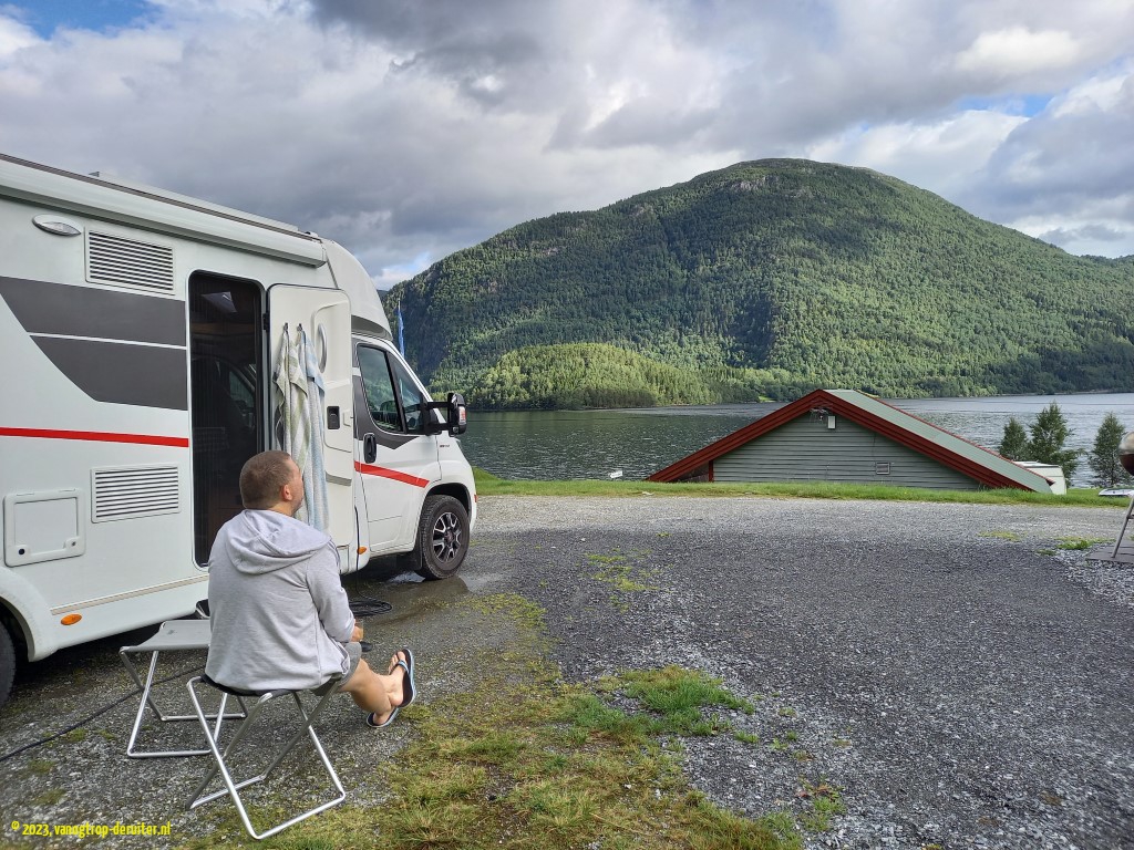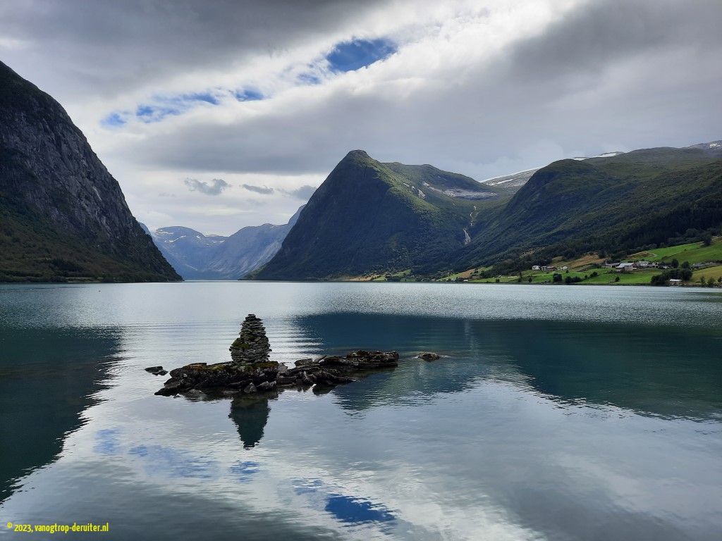 Our overnight stop would be at Astruptunet, on the Jolstravatnet. A quiet spot, with a wonderful artistic sunset providing the backdrop to skipping stones. The next morning also provided picture-perfect views, thanks to light clouds, sunshine, and no wind. Ellen & Luc had a short MTB ride here before we packed up, resuming our northbound journey. Within a couple of kilometers we were treated to a wonderful fjord vista with dramatic mountain slopes and clearly a glacier in the distance – little did we know then that within a week we would be on the other side of that same glacier, some ยฑ25km as the crow flies(!). Another fjord crossing, across the Nordfjord, and our destination was the Nesjartun campsite; specifically chosen so that we could do our laundry, and enjoy a proper shower … ๐
