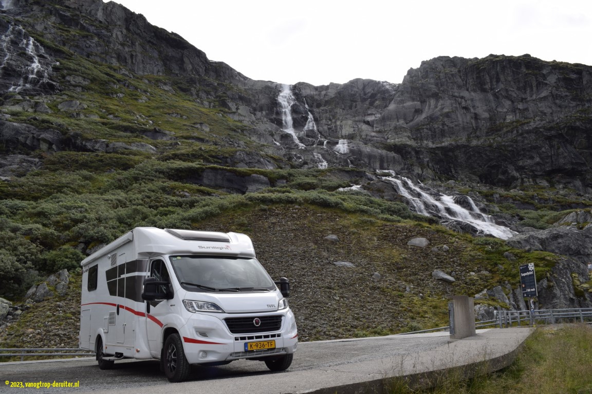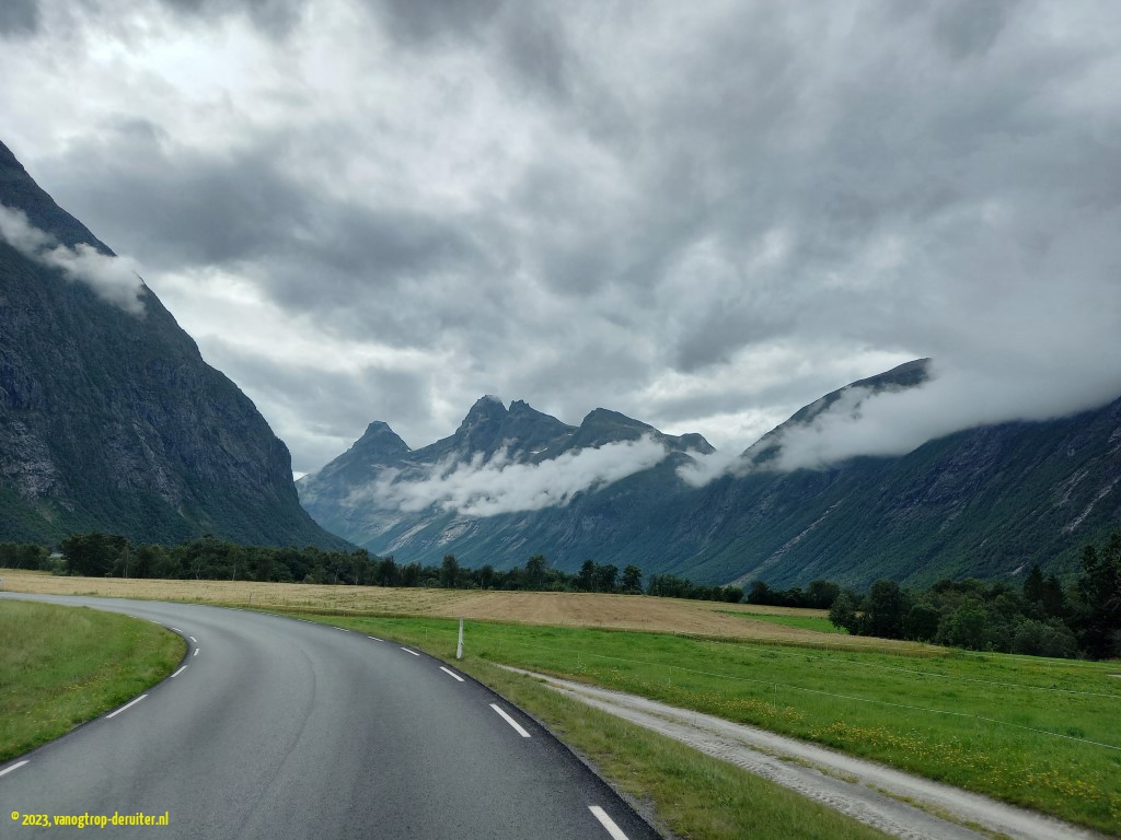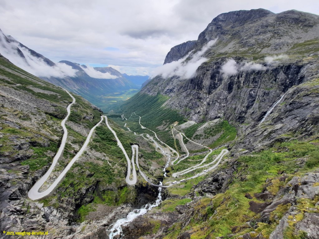 Our southbound journey was now a fact, and more tourist routes awaited us – the first would be the Trollstigen, the ‘troll steps’ ascending ยฑ700m with 11 hairpin bends(!), another Turisterveger. We completed the ascent without much ado, waiting here ‘n there for passing traffic; however once we were at the viewing balcony we were treated to multiple infarcts involving buses, which made us realise how lucky we’d been … ๐