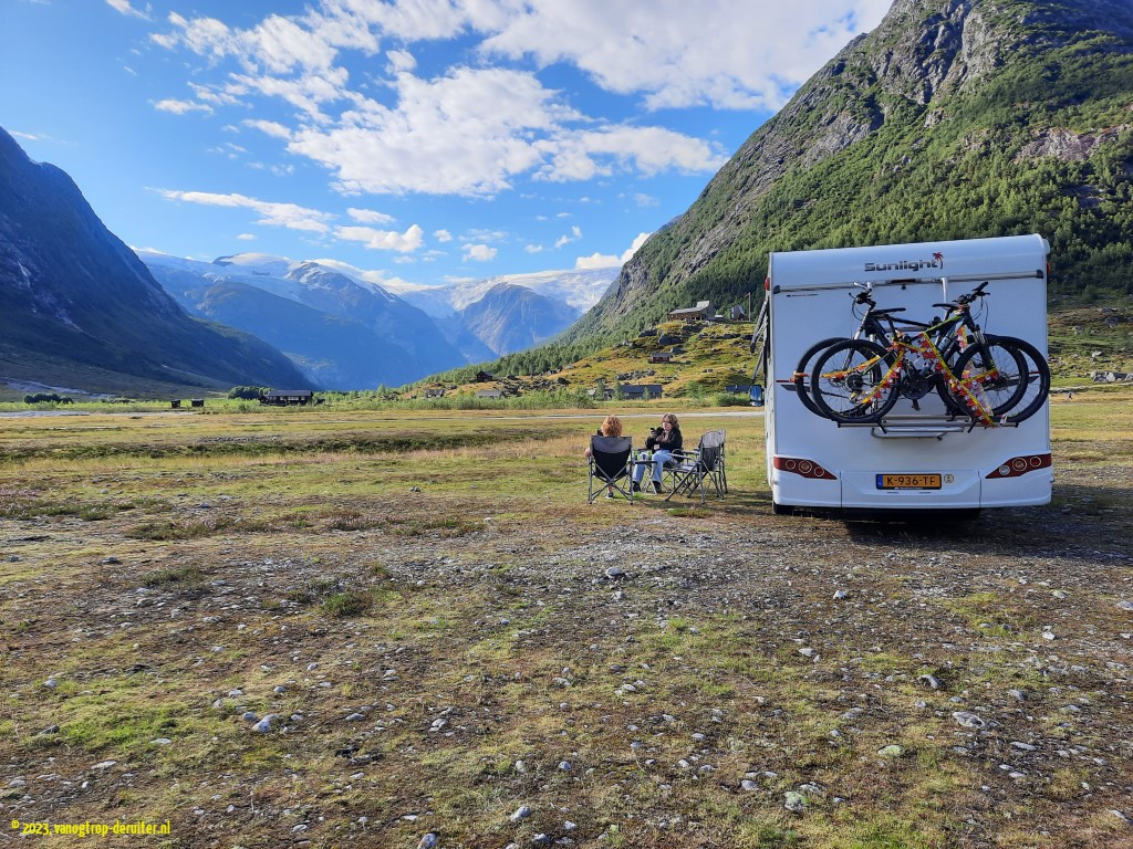 As a Turisterveger, the Sognefjellet rates as one of the most beautiful – rightly titled The roof of Norway, it’s a picturesque drive across a high plateau, with glaciers on both sides (and the sunshine helped!) … ๐ From here the route went on to Fortun & Skjolden and the Lustrafjorden, with a forced stop for the headaches which developed during the descent. Our destination for today would be a ‘Google Maps’ location at Tungestolen, a location chosen for a 2-night stay and a glacier visit. What’s not apparent in Google Maps is the road itself – narrow, long – but we just took it easy, substantially exceeding the Maps driving time estimate … ๐