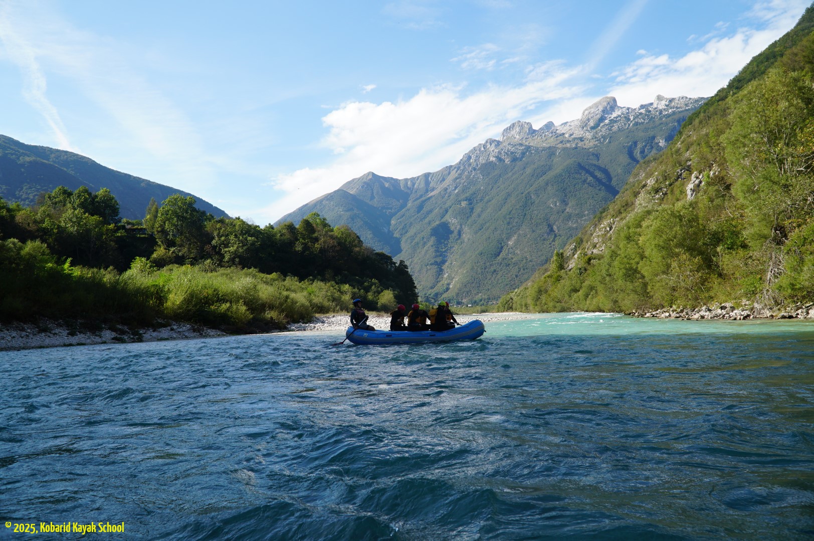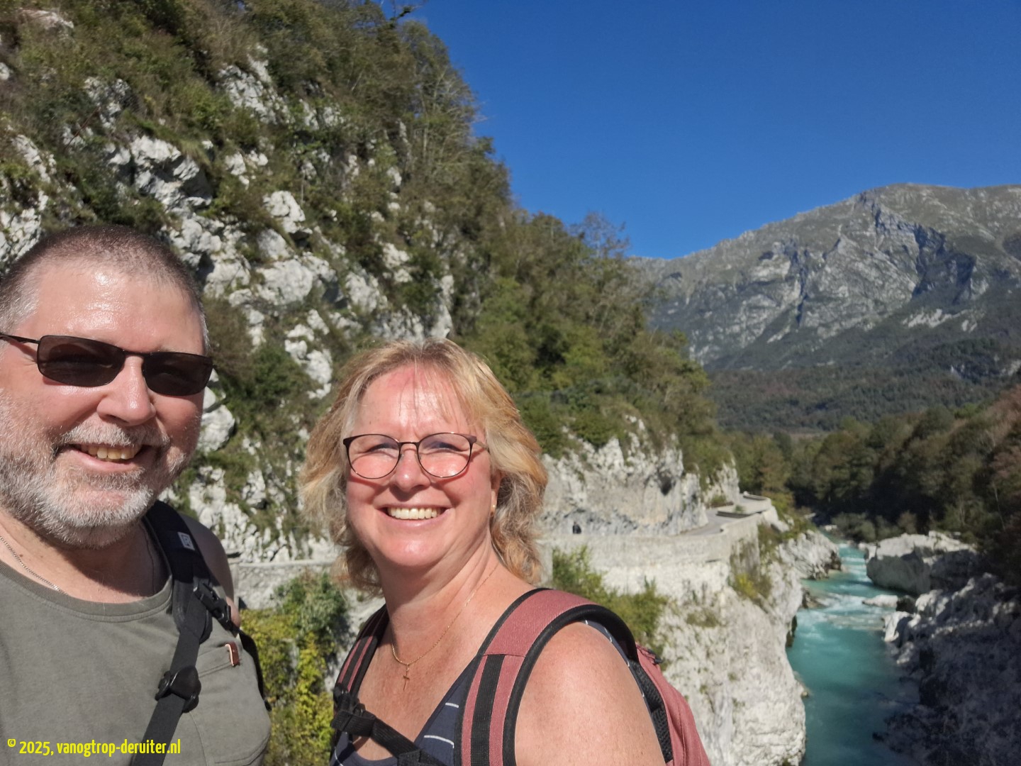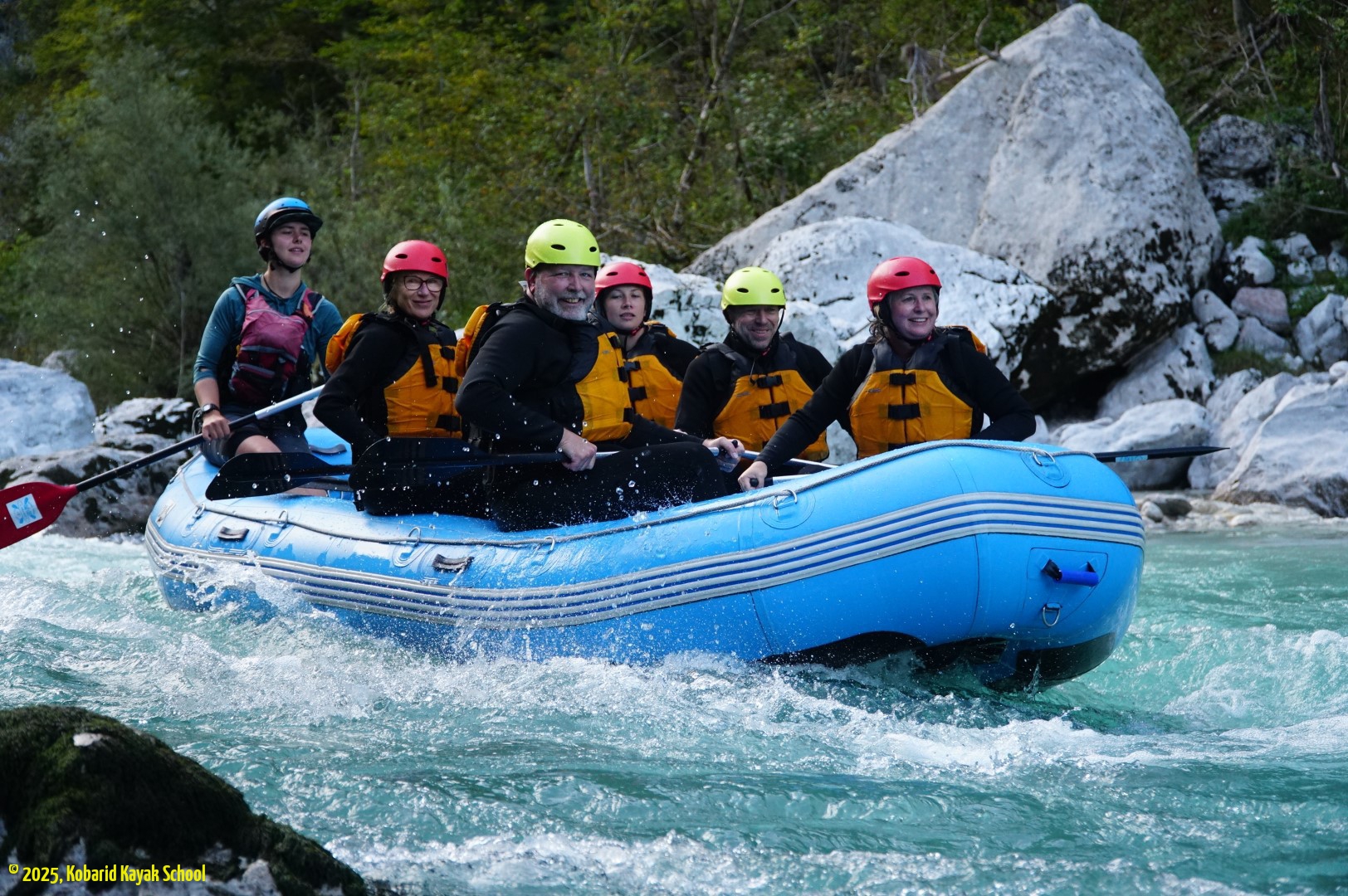 We left the Vipava Valley on day 7, heading northwest for Tolmin and the Tolminska korita – a spectacular gorge with a loop walking trail where we spent a couple of hours. From Tolmin we headed towards Kobarid and our overnight stop at Kamp Koren. This would also be a 2-night stay once we made the spur-of-the-moment decision to do a white-water rafting trip the next day on the Soฤa River. Day 8 started with a walk from the campsite to the nearby Slap Kozjak, a picturesque canyon waterfall. In the afternoon we were picked up by our guides and transported to the rafting drop-off point; suited up (for the 10ยฐC water) and given a full safety briefing. With just 5 of us in the raft it was really enjoyable, and Maria (our Kiwi steerman/con) coached us well, guided us perfectly, and made us work hard (Party …! ๐).